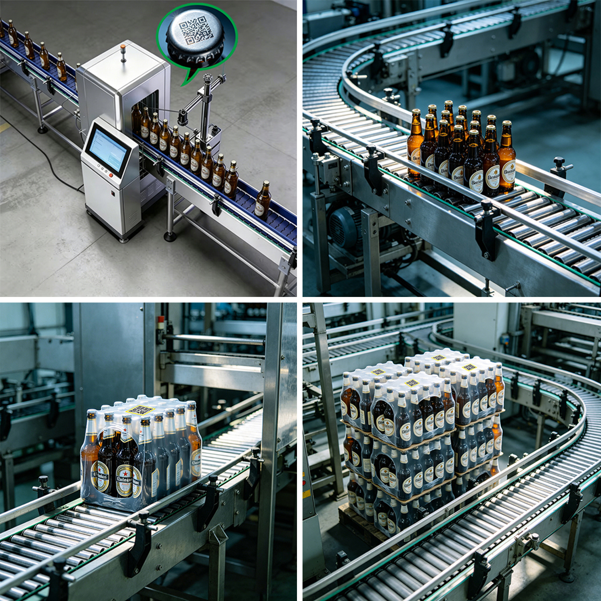 Данный проект применяется на производственной линии пивоваренного завода в Азербайджане и предназначен для создания комплексной системы контроля подлинности и отслеживания продукции **один код — один предмет**. После заполнения и закрытия бутылок пиво система автоматически присваивает код в месте крышки и наклеивает матричный QR-код с данными. Затем высокоточные визуальные устройства обнаруживают и собирают информацию из QR-кода, которая в реальном времени загружается в систему управления отслеживанием, обеспечивая возможность проверки, подтверждения и прослеживаемости данных по каждой отдельной бутылке.